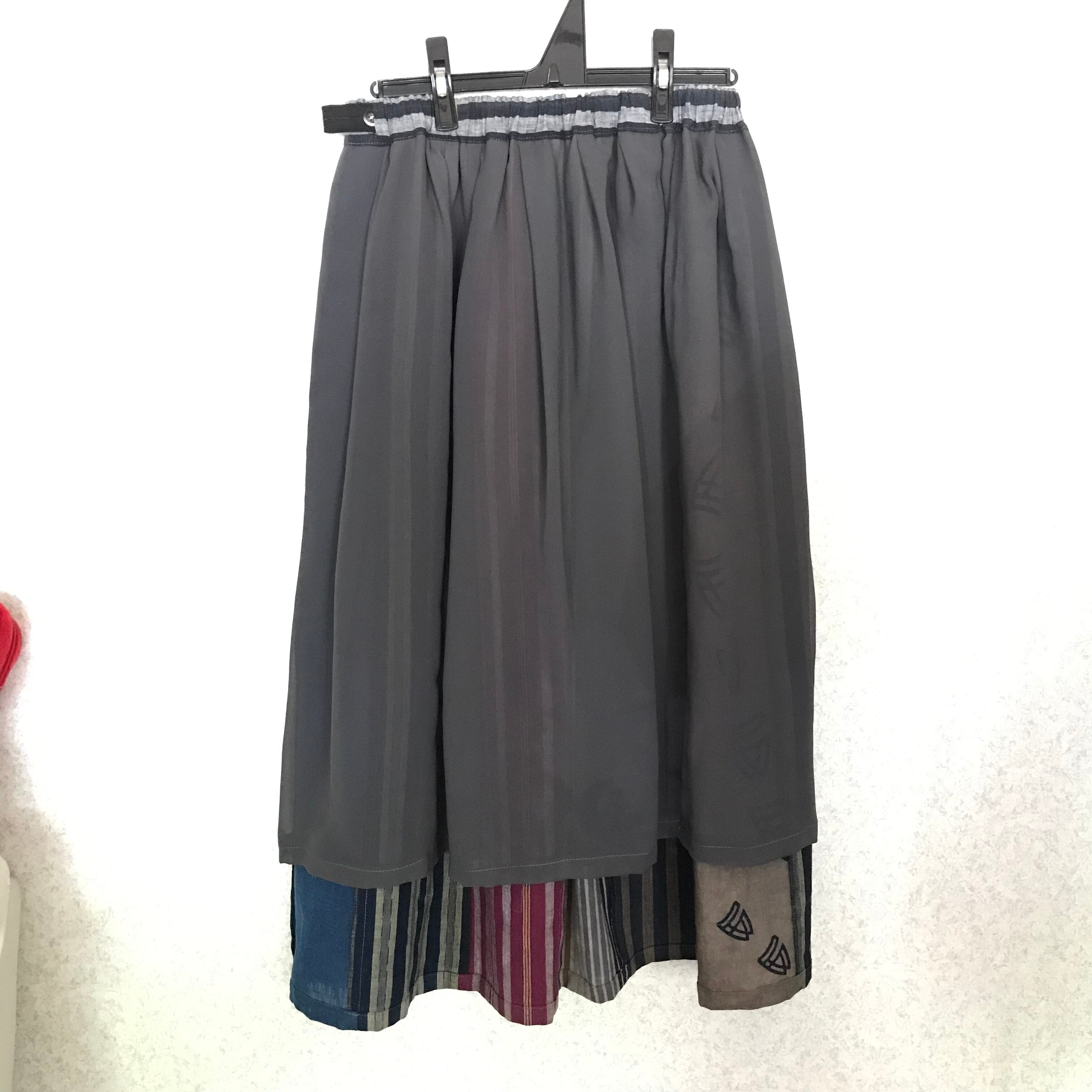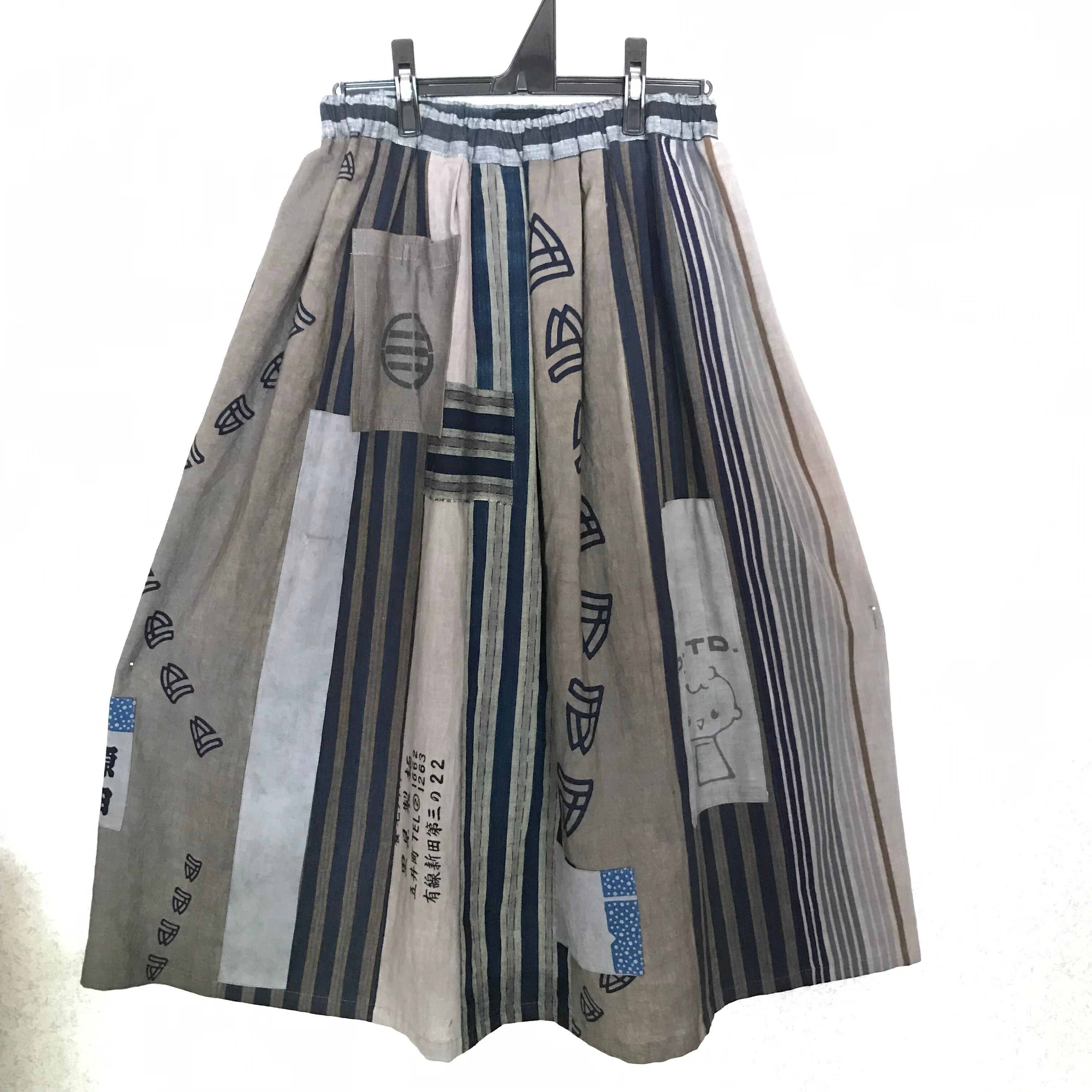 古い木綿縦縞の古布(布団皮)と男物の木綿着物、柿渋染めと鉄媒染を施した手拭いと浴衣地、全て縫い合わせて縦接ぎのロングスカートに仕上げました。