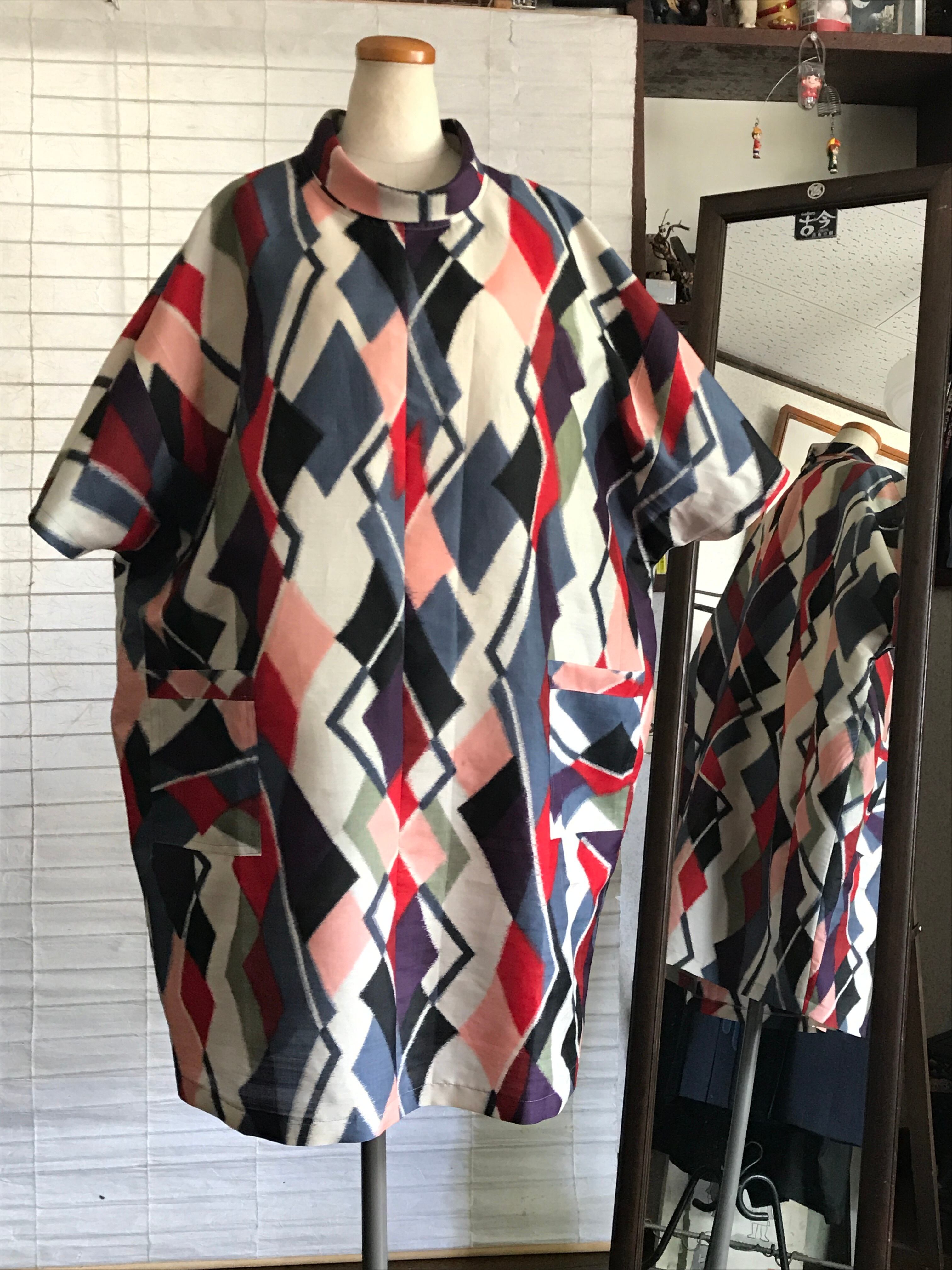 一枚でパッと目を引く鮮やかな色合いの銘仙を使いワンピースにしました。上品なロールカラーが活きるパリッと張りのあるタイプの銘仙を使用してます。