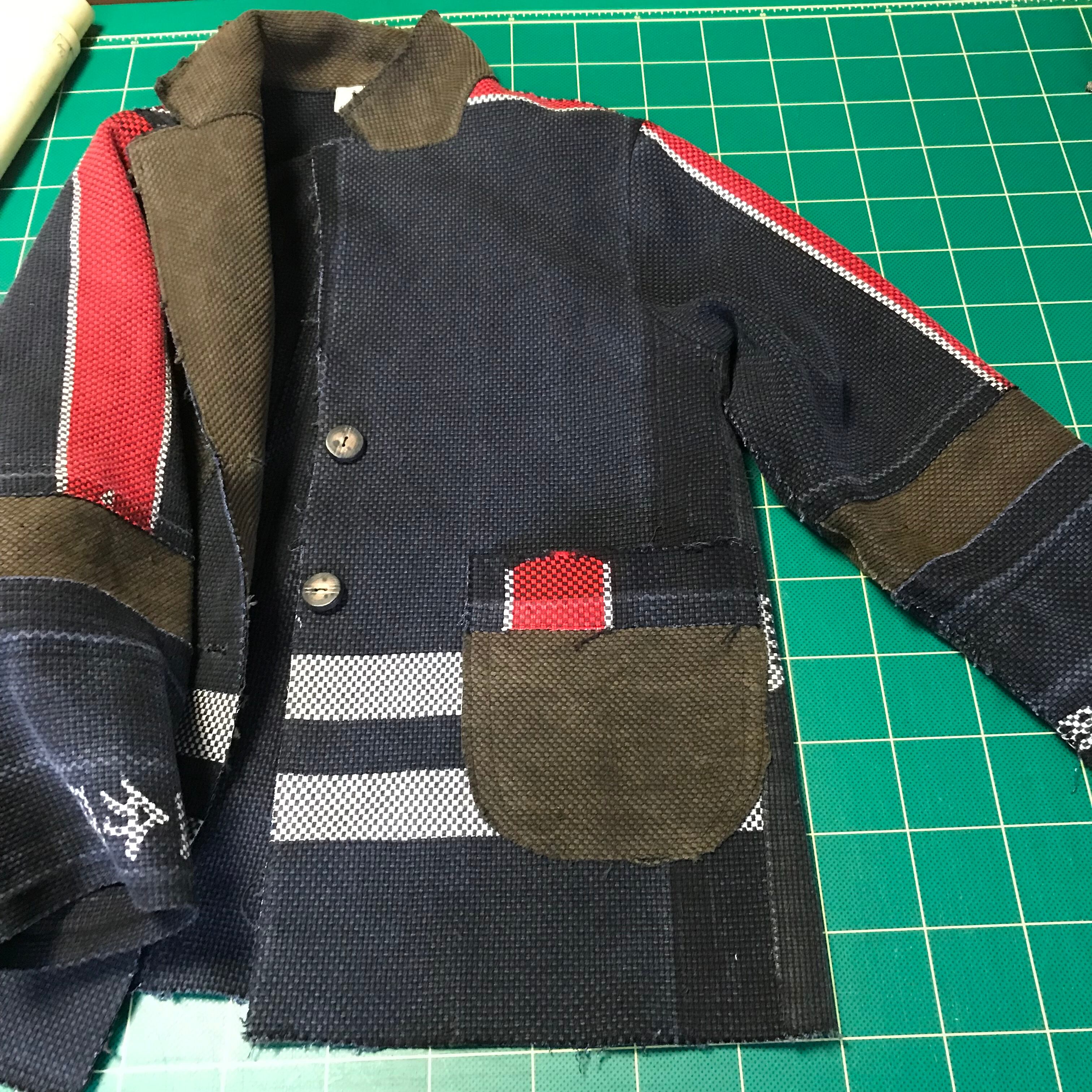 古い消防半纏を断ちっぱなしデザインのテーラードジャケットに仕上げました。